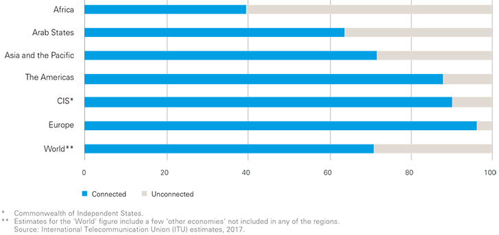 Η αντίστοιχη αναλογία νέων χωρίς πρόσβαση στο Διαδίκτυο στην Ευρώπη είναι μόλις 1 στους 25Για παράδειγμα, οι αφρικανικές νεολαίες είναι οι λιγότερο συνδεδεμένες, με περίπου τρεις στους πέντε νέους να βρίσκονται εκτός σύνδεσης με το Διαδίκτυο, σε σύγκριση με μόλις έναν στους 25, που είναι η αντίστοιχη αναλογία στην Ευρώπη.