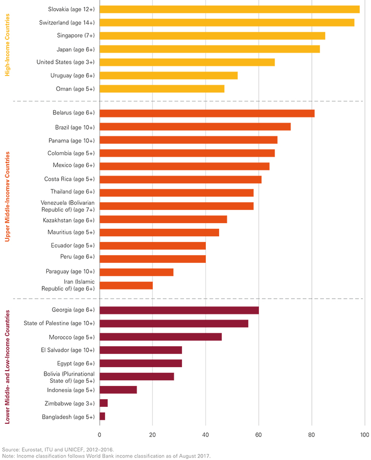 CHILDREN FROM THE LOWEST-INCOME COUNTRIES USE THE INTERNET LEAST PERCENTAGE OF UNDER-15 CHILDREN USING THE INTERNET, SELECTED COUNTRIES AND TERRITORIES, 2012–2016