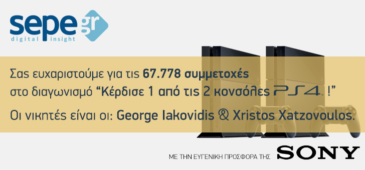 Μετά από ηλεκτρονική κλήρωση (www.randompicker.com), η οποία έλαβε χώρα στα γραφεία του Συνδέσμου Επιχειρήσεων Πληροφορικής & Επικοινωνιών Ελλάδας (Αμβροσίου Φραντζή 19, Αθήνα) παρουσία του Νομικού Συνεργάτη του ΣΕΠΕ, οι τυχεροί που κερδίζουν 1 από τις 2 κονσόλες PS4 είναι, οι George Iakovidis και Xristos Xatzovoulos. Η αναπληρωματικοί νικητές είναι οι Ελένη Ανδρεοπούλου και Efi Karagrigoriou.