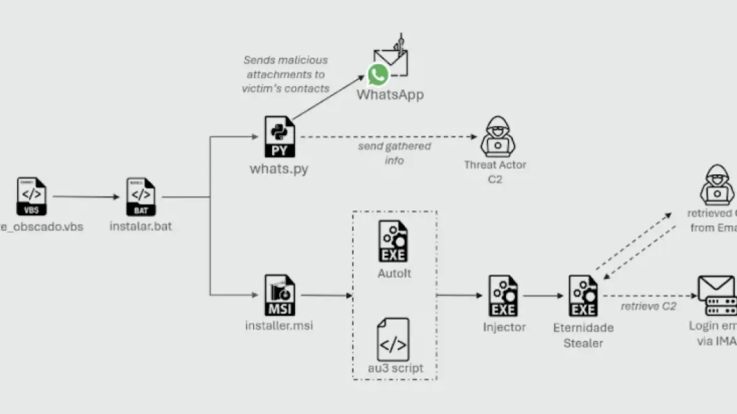 Eternidade Stealer spreads via WhatsApp hijacking, using Python scripts and IMAP-driven C2 updates to target Brazilian users.