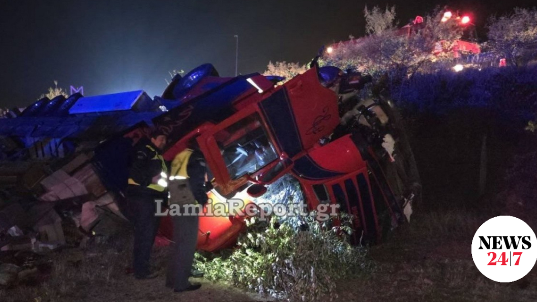 Σύμφωνα με πληροφορίες «έσκασε» το μπροστινό δεξί λάστιχο και η νταλίκα ανατράπηκε στο πρανές της εθνικής οδού.