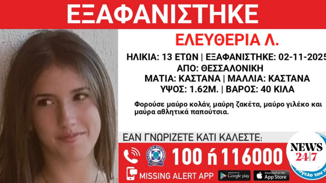 Τα ίχνη της 13χρονης Ελευθερίας Λ. χάθηκαν από το σπίτι της στη Θεσσαλονίκη στις 2 Νοεμβρίου. Η ανακοίνωση που εξέδωσε «Το Χαμόγελο του Παιδιού».