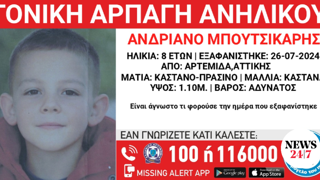 Συνεχίζεται η αναζήτηση του 8χρονου Αντριάνο Μπουτσικάρη. Η μητέρα του προέβη σε αρπαγή του ανήλικου από την περιοχή της Αρτέμιδας Αττικής και έκτοτε αγνοούνται.