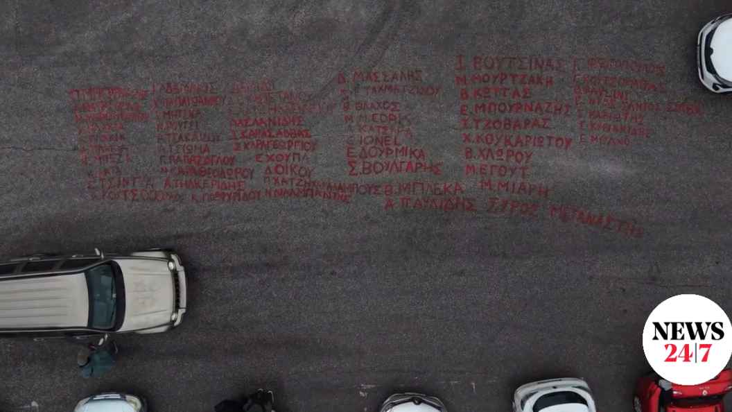 Δίκη για τα Τέμπη: Τα ονόματα των 57 θυμάτων γραμμένα με μπογιά έξω από το συνεδριακό κέντρο