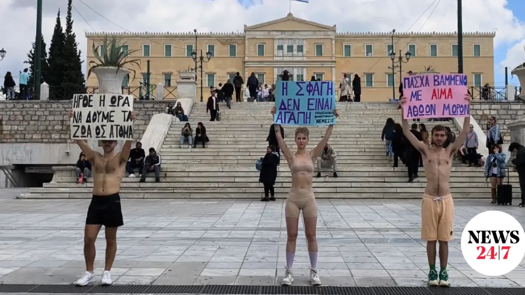 Bίγκαν ακτιβιστές συγκεντρώθηκαν στην πλατεία Συντάγματος, κρατώντας πλακάτ με μηνύματα όπως «Η σφαγή δεν είναι αγάπη».