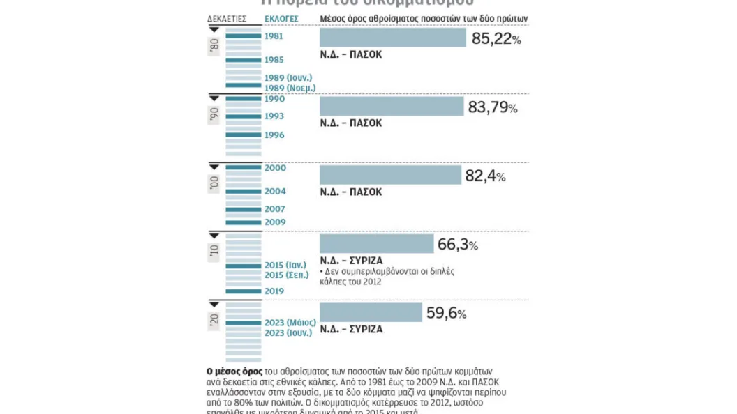 Από το 2023 και την κατάρρευση του ΣΥΡΙΖΑ το πολιτικό σύστημα κινείται με τη λογική του «ενάμισι κόμματος», εξέλιξη που έχει ευνοήσει τη Ν.Δ.
