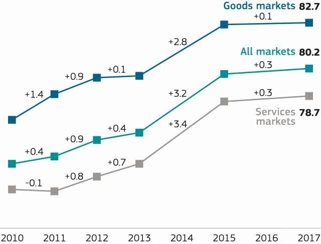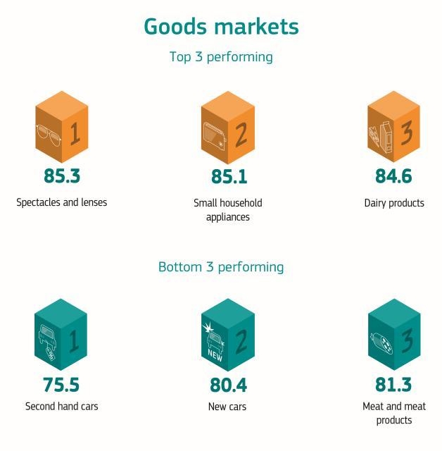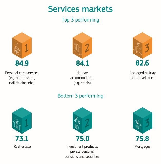 Ενώ η συνολική εμπιστοσύνη στις αγορές ακολουθεί θετική πορεία από το 2010, η έκθεση αποκαλύπτει ότι μόνο το 53% των καταναλωτών έχουν τη βεβαιότητα ότι οι επιχειρήσεις στους τομείς των υπηρεσιών συμμορφώνονται με τους κανόνες προστασίας των καταναλωτών. Για τα αγαθά, το ποσοστό είναι ελάχιστα υψηλότερο, μόλις 59%. Ένα θετικό στοιχείο είναι το συμπέρασμα της έκθεσης σύμφωνα με το οποίο οι διαφορές Ανατολής-Δύσης σε θέματα εμπιστοσύνης των καταναλωτών σιγά - σιγά μειώνονται. Επίσης, για υπηρεσίες, όπως οι υπηρεσίες προσωπικής φροντίδας (κομμωτήρια, σπα), τα καταλύματα διακοπών και οι οργανωμένες διακοπές, το επίπεδο εμπιστοσύνης των καταναλωτών είναι υψηλό.