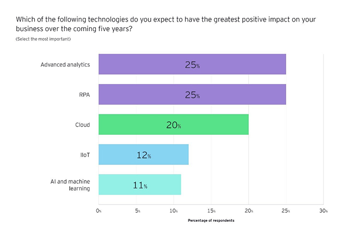 Για τον κλάδο της ενέργειας, η ρομποτική αυτοματοποίηση διαδικασιών (RPA) και τα προηγμένα analytics θα έχουν το μεγαλύτερο αντίκτυπο στον κλάδο τα επόμενα πέντε χρόνια, με τις δύο τεχνολογίες να αναφέρονται από το 25% των ερωτηθέντων αντίστοιχα. Οι περισσότεροι συμμετέχοντες (75%) λένε ότι ήδη ενσωματώνουν το RPA στις διαδικασίες τους, ενώ το 87% ότι χρησιμοποιεί προηγμένα analytics στην προσπάθεια χρήσης των δεδομένων για να αυξήσει την παραγωγικότητα.
