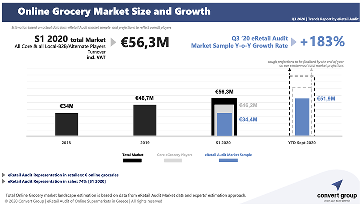 Κατά 183% αυξήθηκε η δαπάνη στα οnline σουπερμάρκετ το 3ο τρίμηνο του 2020, σύμφωνα με την Convert GroupΉδη, το 3ο τρίμηνο του 2020 (Ιούλιο, Αύγουστο, Σεπτέμβριο), η αξία online αγορών σε σουπερμάρκετ στην Ελλάδα κατέγραψε εντυπωσιακό ρυθμό ανάπτυξης της τάξης του 183%, συγκριτικά με το αντίστοιχο τρίμηνο του 2019. Σύμφωνα με τα στοιχεία της Convert Group, το ψηφιακό κανάλι συνέχισε να αναπτύσσεται με ρυθμό σχεδόν ίδιο με αυτόν του 2ου τριμήνου (Απρίλιος, Μάιος, Ιούνιος), περιόδου δηλαδή καραντίνας και μέτρων απαγόρευσης της κυκλοφορίας.