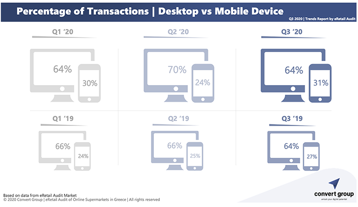 Όσον αφορά τις συσκευές, που προτιμούν οι καταναλωτές για τις παραγγελίες, αν και οι κινητές συσκευές σημείωσαν πτώση το 2ο τρίμηνο του 2020 λόγω του εγκλεισμού, αλλά και της ανάγκης για μεγάλες παραγγελίες, στο 3ο τρίμηνο, ανέκτησαν τη δυναμική τους. Ειδικότερα, καταγράφηκε αύξηση 7 ποσοστιαίων μονάδων, με τις αγορές μέσω κινητού να είναι υπεύθυνες για το 31% των συνολικών παραγγελιών.