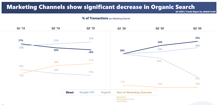 Αναφορικά με τα marketing κανάλια, οι οργανικές αναζητήσεις μετά από την αξιοσημείωτη αύξηση, που είχαν κατά την περίοδο της καραντίνας, υποχώρησαν το 3ο τρίμηνο. Συγκεκριμένα, μειώθηκαν κατά 9 ποσοστιαίες μονάδες, φτάνοντας στο 15%, ποσοστό ίσο με αυτό που σημείωσαν και την ίδια περίοδο το 2019.