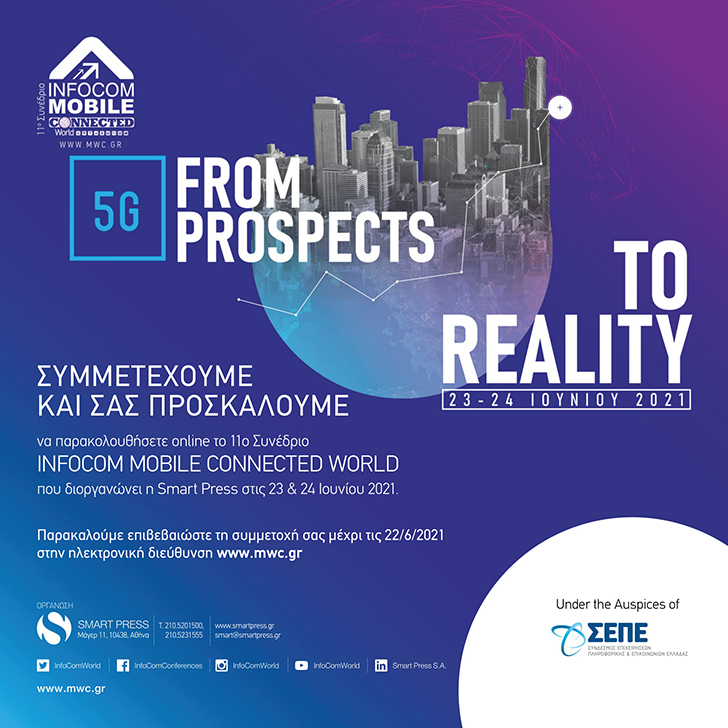 Έναρξη 09:00 - Λήξη 17:00Σας ενημερώνουμε ότι στις 23 & 24 Ιουνίου 2021 διοργανώνεται το 11ο 5G Mobile & Connected World Conference 2021: “5G: From prospects to reality”! από την Smart Press. Σε μία περίοδο, όπου η σημασία της διασύνδεσης κάθε είδους συσκευών βρίσκεται σε πολύ υψηλά επίπεδα και ο ψηφιακός μετασχηματισμός είναι μία έννοια με την οποία ασχολείται το σύνολο των επιχειρήσεων αλλά και των πολιτών. Οι νέες υπηρεσίες και εφαρμογές, αλλά και οι δυνατότητες των 5G δικτύων, θα είναι ένα από τα κύρια θέματα συζήτησης στο φετινό Mobile Connected World, το οποίο τελεί υπό την υποστήριξη του ΣΕΠΕ.