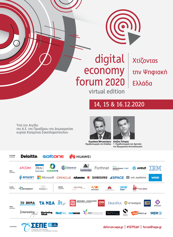 Στη νέα πραγματικότητα που έχει δημιουργήσει η πανδημία του COVID-19, η τεχνολογία τόσο στην Ευρώπη όσο και στην Ελλάδα κατέχει καίριο ρόλο και αποτελεί θεμελιώδη προτεραιότητα για την κοινωνία και την οικονομία. Μέσα σε αυτήν την τραγική κρίση, η στρατηγική κατεύθυνση για τη μετάβαση σε μία σύγχρονη “ψηφιακή” Ελλάδα με αποφασιστικότητα και σχέδιο αποτελεί κοινό στόχο όλων μας. Σε αυτό το πλαίσιο, ο Σύνδεσμος Επιχειρήσεων Πληροφορικής και Επικοινωνιών Ελλάδας (ΣΕΠΕ) διοργανώνει το digital economy forum 2020: Χτίζοντας την Ψηφιακή Ελλάδα.