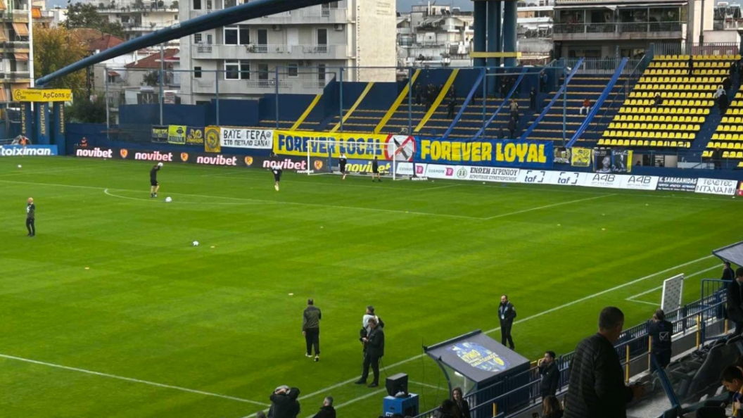 Οι φίλοι του Παναιτωλικού έστησαν πανό στη θύρα των οργανωμένων στον αγώνα με την ΑΕΛ Novibet για τον δολοφονημένο φίλο της ΑΕΚ, Μάριο Ρουμπή.