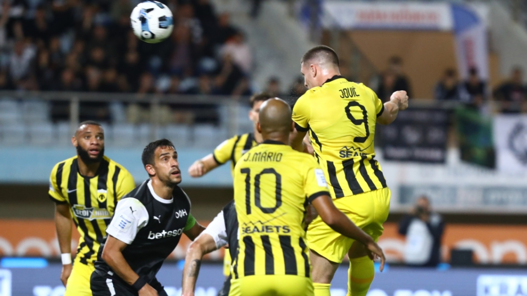 Στο 58ο λεπτό της αναμέτρησης της ΑΕΚ με τον ΟΦΗ ο Γιόβιτς σκόραρε με κεφαλιά αλλά το κγολ ακυρώθηκε για φάουλ του Μουκουντί.