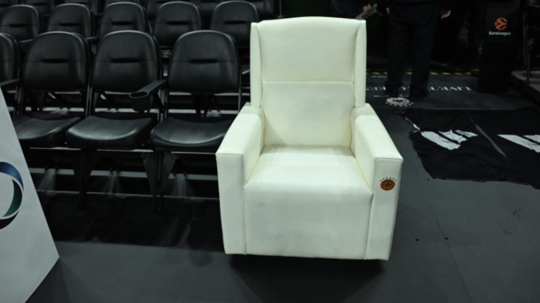 Η πολυθρόνα στην οποία κάθεται συνήθως ο Δημήτρης Γιαννακόπουλος τοποθετήθηκε στο παρκέ τρεις ώρες πριν από το τζάμπολ του ντέρμπι Παναθηναϊκού - Ολυμπιακού.