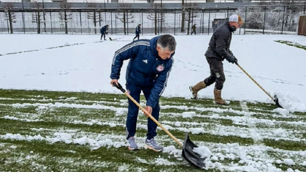 Μία τρομερή εικόνα έλαβε μέρος στην προπόνηση του Ολυμπιακού επί ολλανδικού εδάφους με τον Χοσέ Λουίς Μεντιλίμπαρ να βοηθά στον καθαρισμό του χιονιού στο γήπεδο.