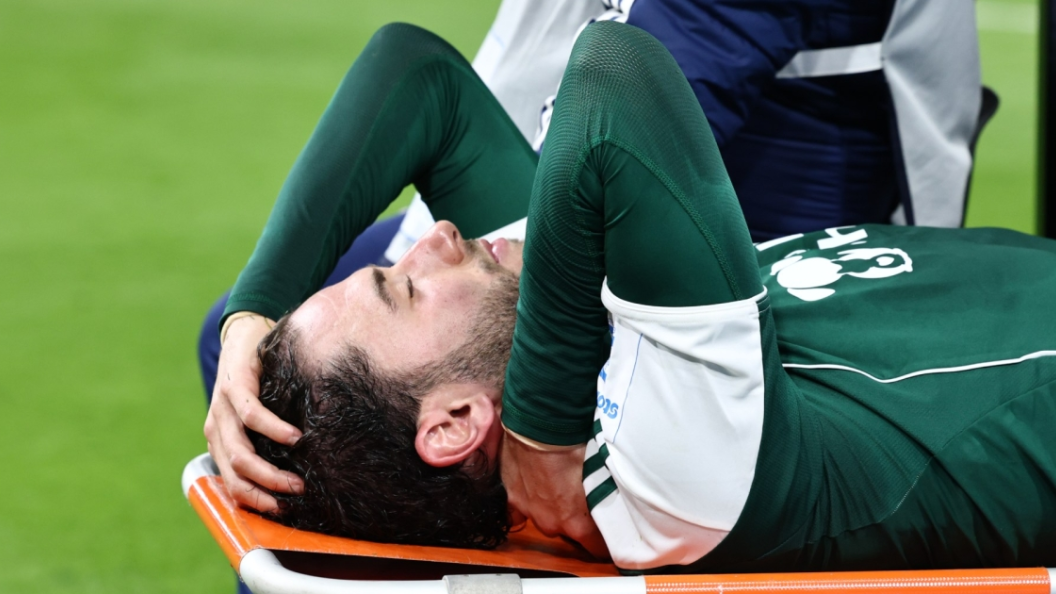 Ο Νταβίντε Καλάμπρια αποχώρησε από το «Γεώργιος Καραϊσκάκης» μετά το Ολυμπιακός - Παναθηναϊκός, έχοντας κολάρο στο λαιμό.
