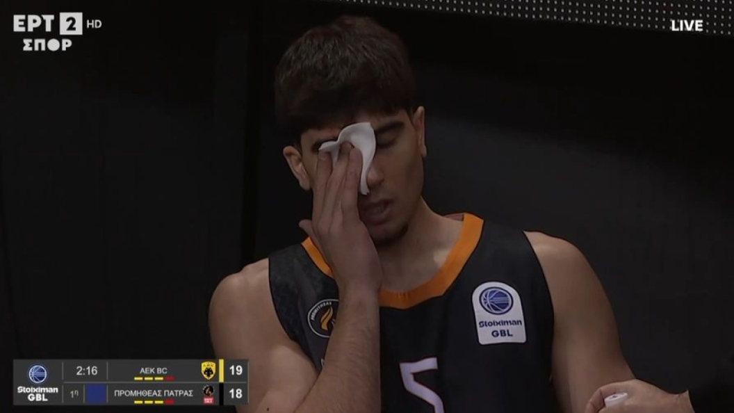 Ο Νίκος Πλώτας τραυματίστηκε στο φρύδι μετά από σύγκρουση με τον Λεκαβίτσιους προς το τέλος της πρώτης περιόδου του ΑΕΚ – Προμηθέας.