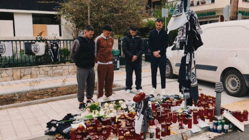 Με λουλούδια και μια φανέλα τίμησαν τη μνήμη του 20χρονου Κλεομένη στο σημείο της δολοφονίας, ο Τεχνικός Διευθυντής Χρήστος Καρυπίδης και οι Ζίβκοβιτς, Τάισον, Ζαφείρης.