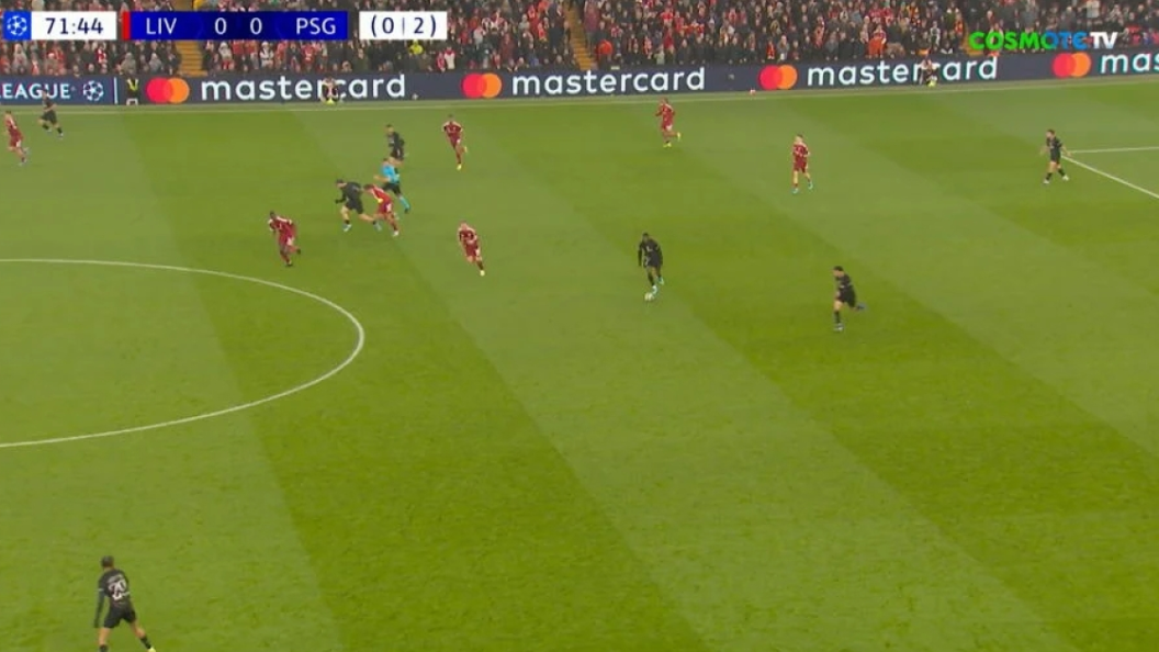 Κόντρα στη ροή του αγώνα ο Ντεμπελέ έφερε τη μπάλα στο αριστερό και με τρομερό πλασέ έξω από την περιοχή έγραψε το 1-0 για την Παρί κόντρα στη Λίβερπουλ.