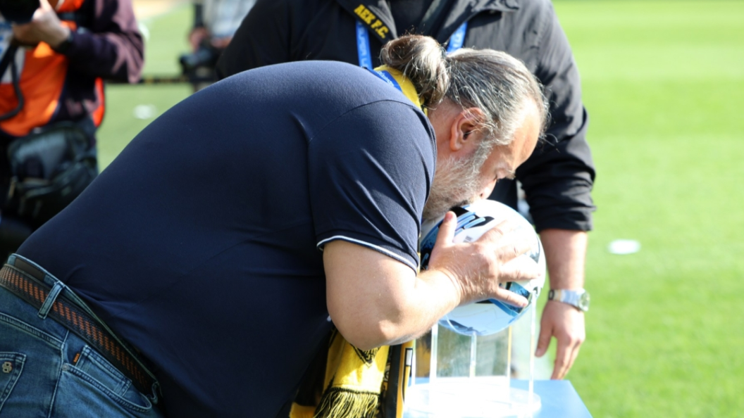 Ο διοικητικός ηγέτης ΑΕΚ, Μάριος Ηλιόπουλος, φίλησε την μπάλα του αγώνα με τον ΠΑΟΚ πριν τη σέντρα.