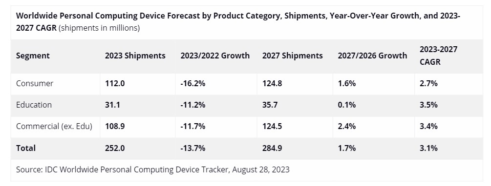 Φως το τούνελ της καθόδου των τελευταίων τριμήνων φαίνεται ότι βλέπει η παγκόσμια αγορά ηλεκτρονικών υπολογιστών, η οποία σταδιακά οδεύει προς τη σταθεροποίηση. Το αρνητικό πρόσημο στις πωλήσεις αναμένεται να γυρίσει σε θετικό έδαφος το 2024, αν και θα παραμείνει και την επόμενη χρονιά κάτω από τα προπανδημικά επίπεδα.