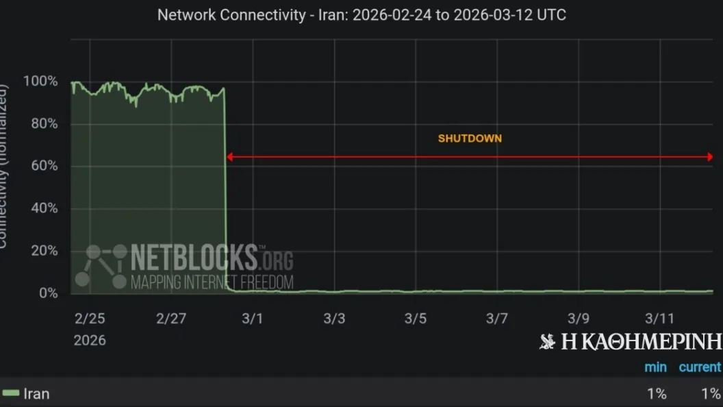 Οι υπολογισμοί της εταιρείας που ελέγχει τις ροές δεδομένων στο διαδίκτυο κατέγραψε την ολοκλήρωση και 12ης ημέρας χωρίς παροχή στο Ιράν.